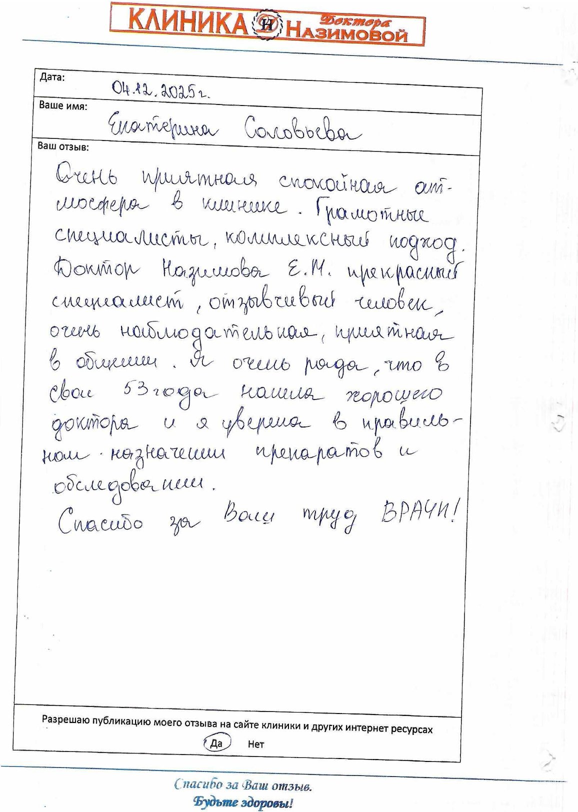 Хочу сказать большое человеческое спасибо вашей Клинике Доктора Назимовой за чуткое отношение к пациентам и высокий профессионализм. Клиника одна из лучших в Юго-Западном округе. Огромная благодарность врачам за их нелегкий труд. Особенно хотелось поблагодарить глав. врача клиники Назимову Е.М., за её внимательность, компетентность и доброжелательность. Все назначения комментирует так, чтобы было понятно и доходчиво для пациента. Также от всего сердца хочу поблагодарить терапевта Колотилину Е.В., хирурга Орлову Е.Н. Таким врачам действительно не страшно доверять своё здоровье! От всей души хочу пожелать дальнейшего процветания и успехов вашей Клинике!