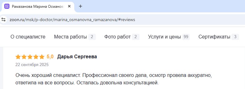 Лучший гинеколог, которого я встречала! Были проблемы с дисплазией шейки матки. Доктор подробно рассказала о методах лечения, помогла принять решение и провела процедуру аккуратно и безболезненно. Я очень рада, что попала к такому замечательному врачу!