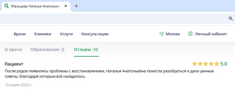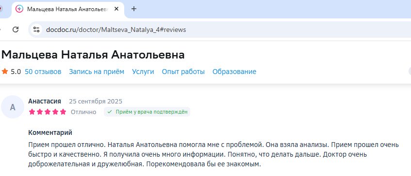 Очень довольна своим гинекологом. Попала к ней по рекомендации и ни разу не пожалела. Врач спокойная, вежливая, на приёме чувствуешь себя комфортно – никакого смущения или напряжения. Всегда объясняет, что и зачем делает, отвечает на вопросы без раздражения. Что особенно важно – подход индивидуальный. Не просто "по шаблону" назначает лечение, а учитывает особенности здоровья. Никакого навязывания дополнительных услуг или ненужных анализов. Кабинет современный, всё чисто. Персонал приветливый. Запись плотная, но записаться можно, обычно принимает вовремя. Если нужно срочно – старается помочь. После многих лет поисков "своего" врача наконец-то могу сказать, что нашла специалиста, которому полностью доверяю. Однозначно рекомендую!