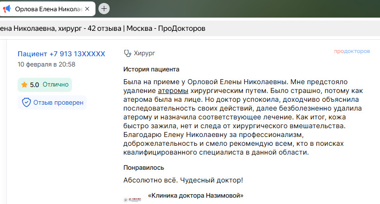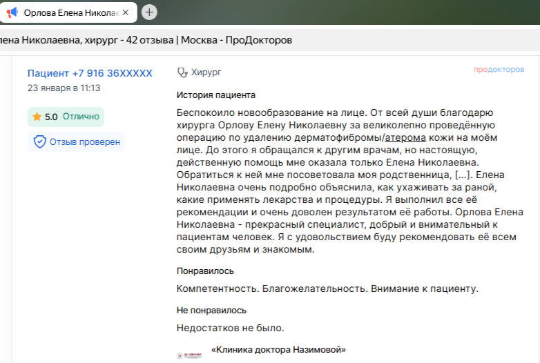Беспокоило новообразование на лице. От всей души благодарю хирурга Орлову Елену Николаевну за великолепно проведённую операцию по удалению дерматофибромы/атерома кожи на моём лице. До этого я обращался к другим врачам, но настоящую, действенную помощь мне оказала только Елена Николаевна. Обратиться к ней мне посоветовала моя родственница. Елена Николаевна очень подробно объяснила, как ухаживать за раной, какие применять лекарства и процедуры. Я выполнил все её рекомендации и очень доволен результатом её работы. Орлова Елена Николаевна - прекрасный специалист, добрый и внимательный к пациентам человек. Я с удовольствием буду рекомендовать её всем своим друзьям и знакомым. Понравилось: Компетентность. Благожелательность. Внимание к пациенту.