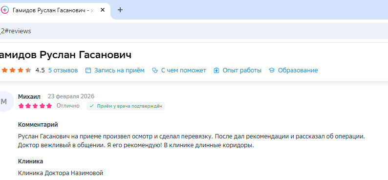 Доктор Гамидов Р. Г. принял пациента очень квалифицированно и уважительно. Разъяснил всё необходимое и дал квалифицированные рекомендации. Оценка 5