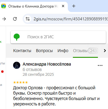 Доктор Орлова - профессионал с большой буквы. Осмотр прошёл быстро и безболезненно. Чувствуется большой опыт и уверенность в работе.
