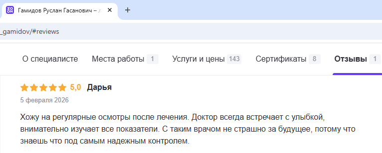 Выражаю огромную благодарность Гамидову Руслану Гасановичу за профессионализм и чуткий подход. Доктор подробно объяснил мне суть проблемы, провел тщательный осмотр и назначил эффективное лечение, которое помогло быстро. Врач внимателен, вежлив и всегда отвечает на все вопросы. Рекомендую этого специалиста