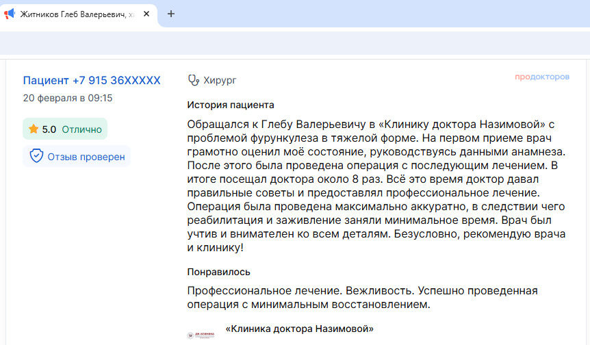 Обращался к Глебу Валерьевичу в «Клинику доктора Назимовой» с проблемой фурункулеза в тяжелой форме. На первом приеме врач грамотно оценил моё состояние, руководствуясь данными анамнеза. После этого была проведена операция с последующим лечением. В итоге посещал доктора около 8 раз. Всё это время доктор давал правильные советы и предоставлял профессиональное лечение. Операция была проведена максимально аккуратно, в следствии чего реабилитация и заживление заняли минимальное время. Врач был учтив и внимателен ко всем деталям. Безусловно, рекомендую врача и клинику! Понравилось: Профессиональное лечение. Вежливость. Успешно проведенная операция с минимальным восстановлением.