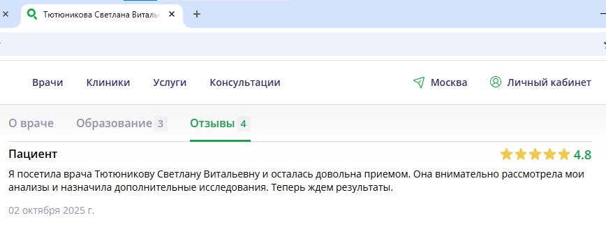 Приём прошел очень хорошо, и все мои ожидания оправдались. Доктор сделала мне УЗИ, проконсультировала и назначила терапию. После врач направила меня на дополнительное обследования. Огромное спасибо! Я думаю, что Наталья Анатольевна очень компетентная и внимательная.