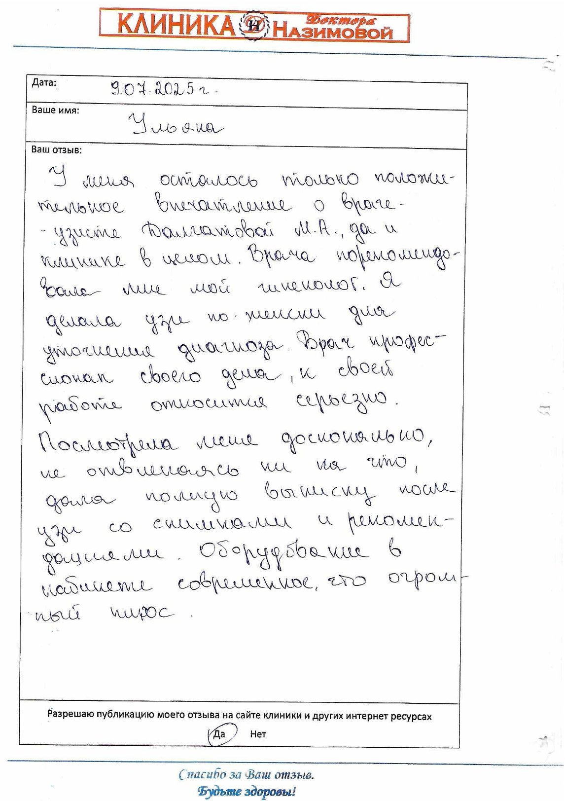 Хочу сказать спасибо специалистам клиники доктора Назимовой, у которых я была на приеме - гинекологу Мальцевой, хирургу Бедняковой и врачу узи Колотилиной. Так получилось, что пришла к гинекологу и сделать узи, а выяснилось, что можно посмотреть и мой вросший ноготь. В итоге в этот день мне лазером подправили ноготь, теперь он не врастает, сделала узи и получила схему лечения. Отличная работа, спасибо!