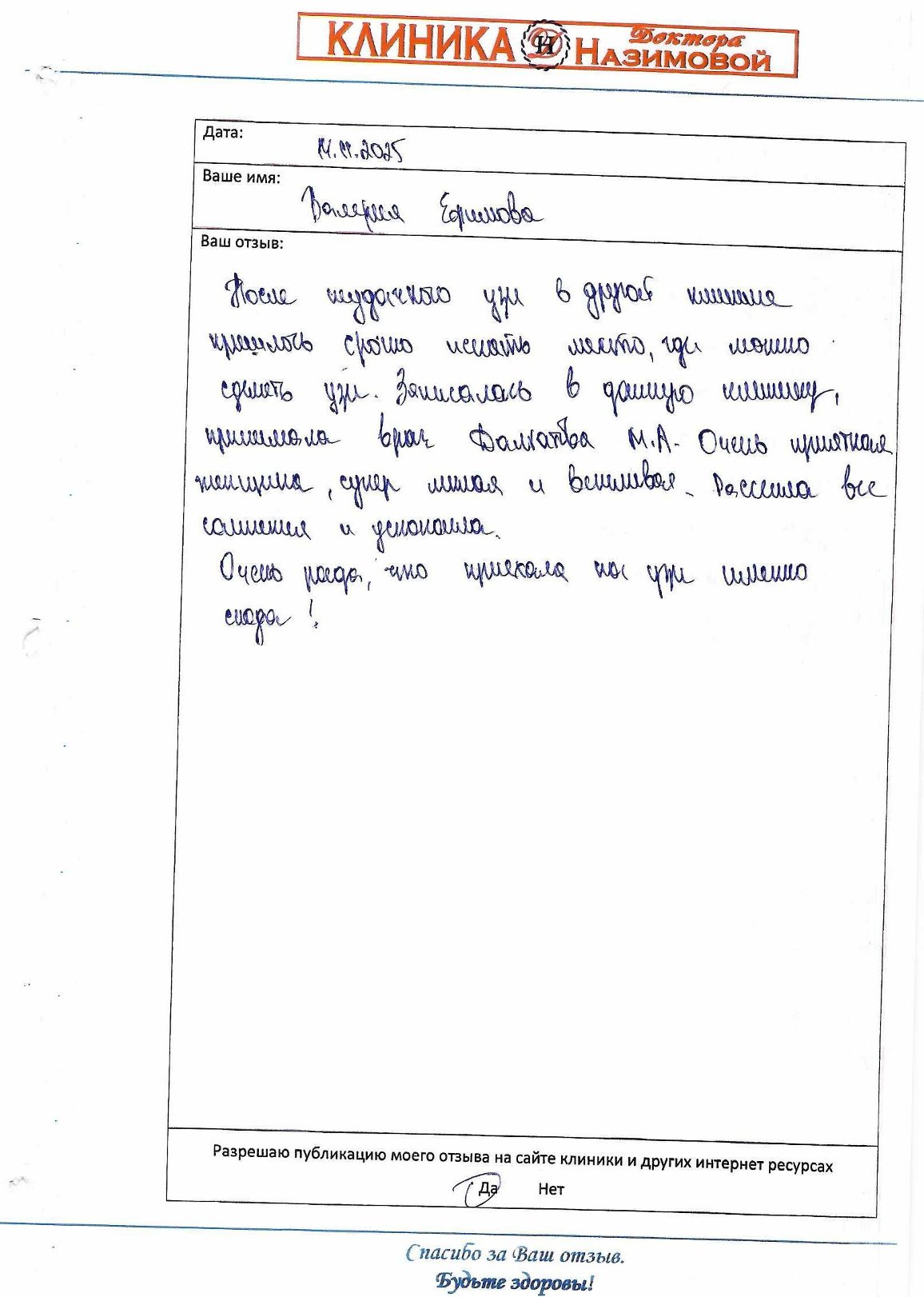 Хочу сказать большое человеческое спасибо вашей Клинике Доктора Назимовой за чуткое отношение к пациентам и высокий профессионализм. Клиника одна из лучших в Юго-Западном округе. Огромная благодарность врачам за их нелегкий труд. Особенно хотелось поблагодарить глав. врача клиники Назимову Е.М., за её внимательность, компетентность и доброжелательность. Все назначения комментирует так, чтобы было понятно и доходчиво для пациента. Также от всего сердца хочу поблагодарить терапевта Колотилину Е.В., хирурга Орлову Е.Н. Таким врачам действительно не страшно доверять своё здоровье! От всей души хочу пожелать дальнейшего процветания и успехов вашей Клинике!