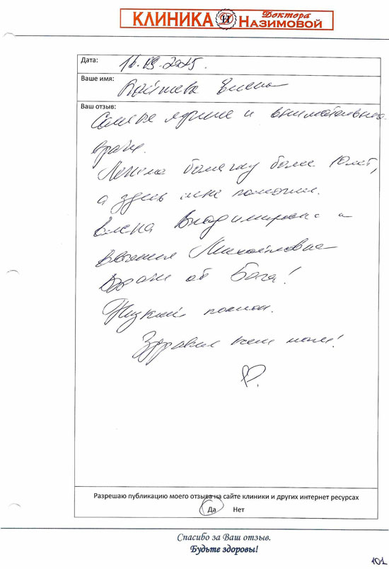 Хочу сказать спасибо специалистам клиники доктора Назимовой, у которых я была на приеме - гинекологу Мальцевой, хирургу Бедняковой и врачу узи Колотилиной. Так получилось, что пришла к гинекологу и сделать узи, а выяснилось, что можно посмотреть и мой вросший ноготь. В итоге в этот день мне лазером подправили ноготь, теперь он не врастает, сделала узи и получила схему лечения. Отличная работа, спасибо!