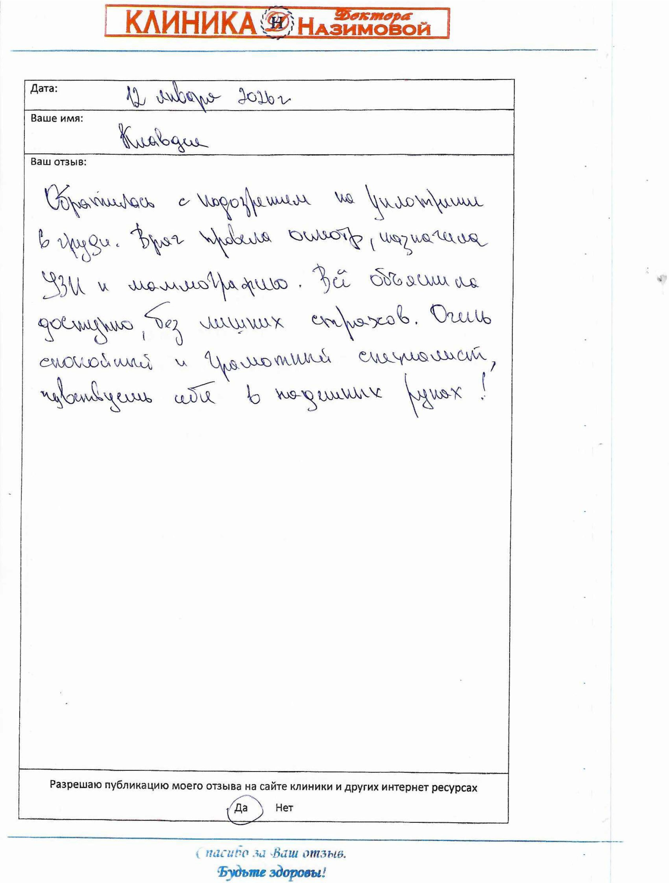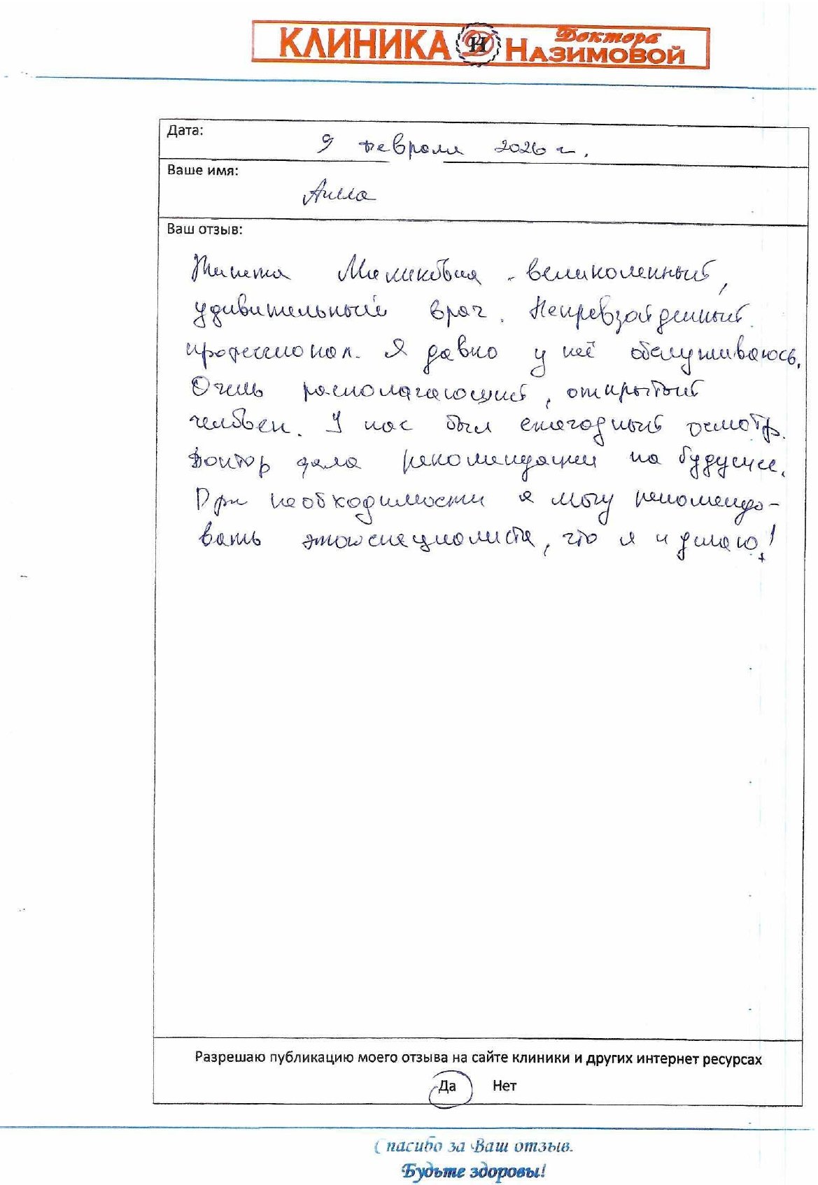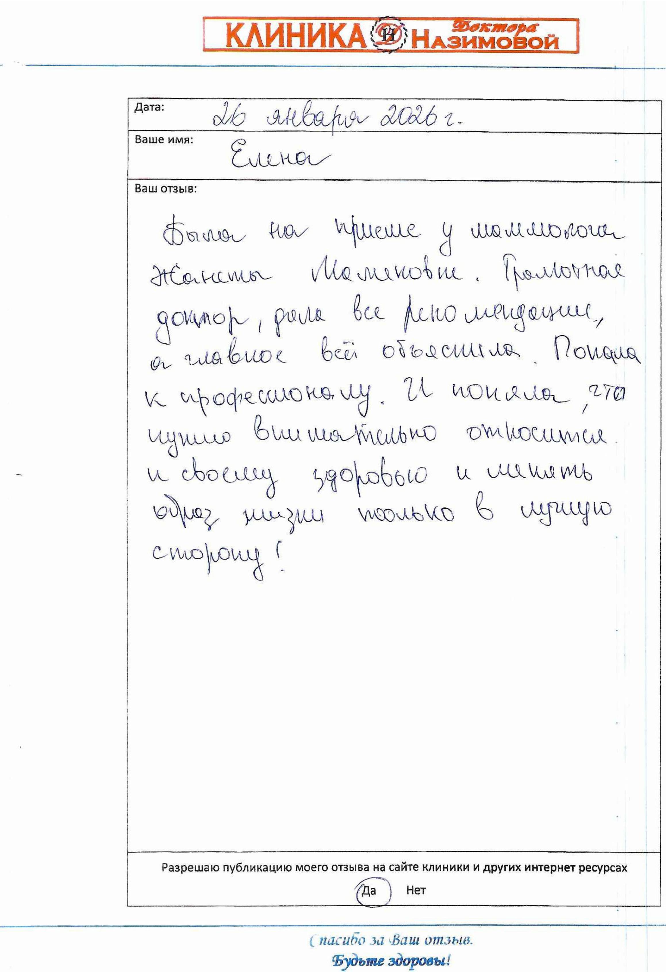 Хочу сказать большое человеческое спасибо вашей Клинике Доктора Назимовой за чуткое отношение к пациентам и высокий профессионализм. Клиника одна из лучших в Юго-Западном округе. Огромная благодарность врачам за их нелегкий труд. Особенно хотелось поблагодарить глав. врача клиники Назимову Е.М., за её внимательность, компетентность и доброжелательность. Все назначения комментирует так, чтобы было понятно и доходчиво для пациента. Также от всего сердца хочу поблагодарить терапевта Колотилину Е.В., хирурга Орлову Е.Н. Таким врачам действительно не страшно доверять своё здоровье! От всей души хочу пожелать дальнейшего процветания и успехов вашей Клинике!
