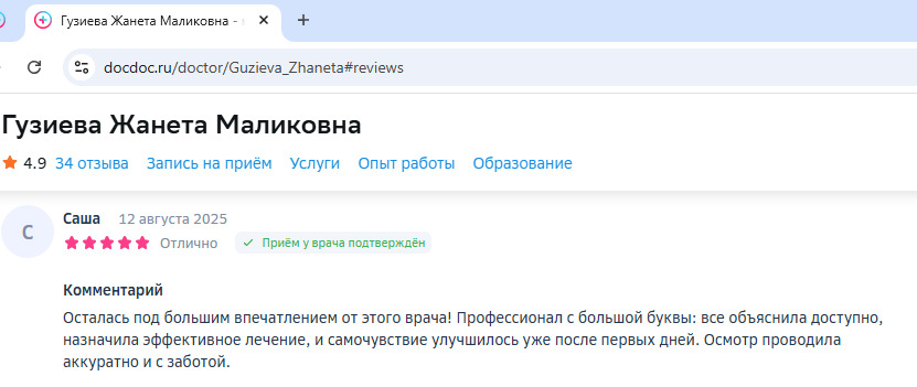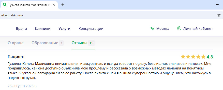 Гузиева Жанета Маликовна внимательная и аккуратная, и всегда говорит по делу, без лишних анализов и натяжек. Мне понравилось, как она доступно объяснила мою проблему и рассказала о возможных методах лечения на понятном языке. Я ужасно благодарна ей за её работу! После визита к ней я вышла с уверенностью и ощущением, что нахожусь в надежных руках.