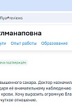 Обратилась к врачу с проблемой повышенного сахара. Доктор назначила все необходимые анализы, подобрала грамотное лечение, и теперь благодаря её внимательному наблюдению и правильно подобранной терапии у меня нормализовался уровень глюкозы в крови. Хочу выразить огромную благодарность этому прекрасному специалисту за профессионализм и чуткое отношение.
