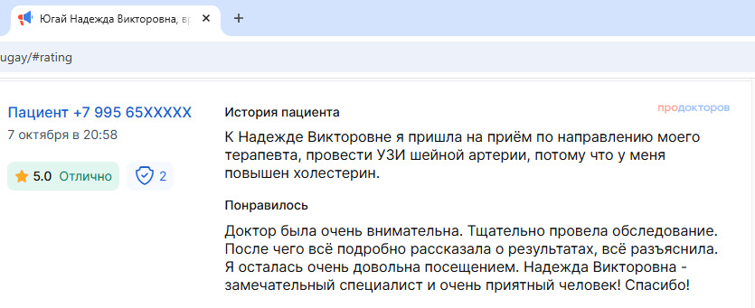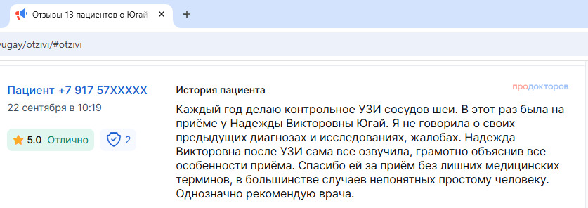 К доктору попала по рекомендации. Нужно было пройти комплексное УЗИ-обследование. Уже с первых минут приёма стало ясно, что я в надёжных руках. Врач внимательно выслушала, уточнила все важные детали и провела диагностику очень тщательно. Особенно порадовало бережное и уважительное отношение: все подробно объясняла, комментировала ход исследования и дала развёрнутые рекомендации. В результате я получила не только чёткую картину состояния органов, но и понятные пояснения без лишней медицинской сложности. Очень благодарна за профессионализм, тёплую атмосферу и индивидуальный подход. Теперь буду обращаться только к этому специалисту и смело рекомендовать её знакомым!
