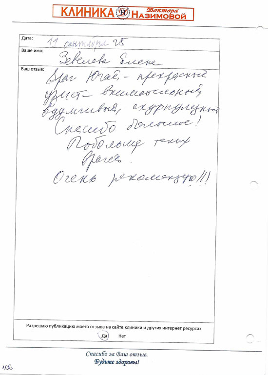 Хочу выразить благодарность всему персоналу клиники Доктора Назимовой. Являюсь клиентом с 2016 года, все это время ни разу не было никаких вопросов по качеству обслуживания и профессионализму врачей. Особо хочу отметить терапевта Колотилину Елену Владимировну и гинеколога Дзансолову Алану Васильевну. Отдельно хочется поблагодарить всех администраторов клиники: всегда точно, четко, вежливо решают любой вопрос. Далеко не каждая частная клиника может похвастаться такими прекрасными администраторами.